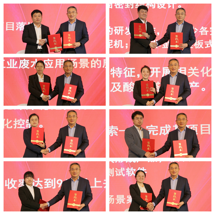 盛典在市經(jīng)開區(qū)管委會(huì)副主任方強(qiáng)的致辭中拉開了帷幕,在接下來的產(chǎn)品推介會(huì)上,來自裝配式水廠、深床反硝化濾池系統(tǒng)、高效/磁混凝系統(tǒng)、BAF智慧工藝、臭廢氣收集及處理系統(tǒng)、工業(yè)物聯(lián)智能控制產(chǎn)品及系統(tǒng)、魔方智水產(chǎn)品、環(huán)保非標(biāo)設(shè)備八個(gè)團(tuán)隊(duì)的產(chǎn)品經(jīng)理從市場角度出發(fā),分享了各自技術(shù)化產(chǎn)品的新功能、新亮點(diǎn)以及產(chǎn)生的效益,并規(guī)劃了2025年的市場工作、產(chǎn)品應(yīng)用場景擴(kuò)展、升級(jí)的思路及目標(biāo)。隨后,會(huì)議舉行了八位產(chǎn)品經(jīng)理與副董事長鄭俊簽約及市場銷售人員誓師儀式。