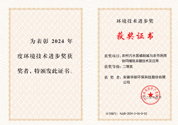 2025年4月,由安徽華騏環(huán)??萍脊煞萦邢薰九c安徽農(nóng)業(yè)大學(xué)聯(lián)合申報(bào)的《農(nóng)村污水氮磷削減與農(nóng)作利用協(xié)同增效關(guān)鍵技術(shù)及應(yīng)用》項(xiàng)目,榮獲中國(guó)環(huán)境保護(hù)產(chǎn)業(yè)協(xié)會(huì)頒發(fā)的2024年度“環(huán)境技術(shù)進(jìn)步獎(jiǎng)”二等獎(jiǎng)。這項(xiàng)科研成果,成功破解了農(nóng)村污水處理與農(nóng)業(yè)資源化利用的協(xié)同發(fā)展難題,為我國(guó)鄉(xiāng)村振興戰(zhàn)略中的生態(tài)治理提供了創(chuàng)新性解決方案。