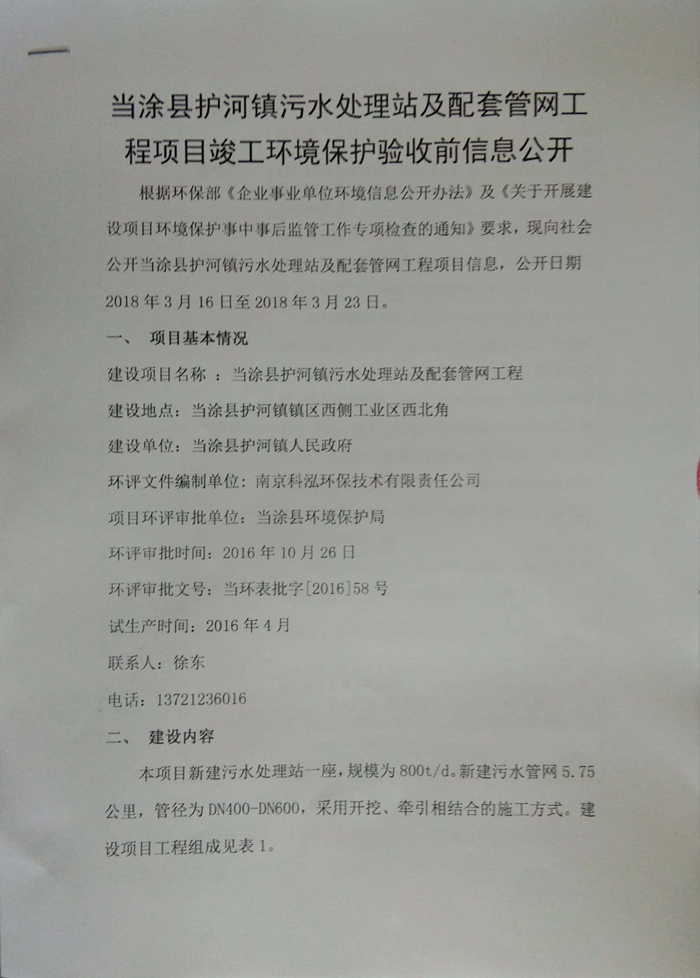 當(dāng)涂縣護(hù)河鎮(zhèn)污水處理站及配套管網(wǎng)工程項(xiàng)目竣工環(huán)境保護(hù)驗(yàn)收前信息公開