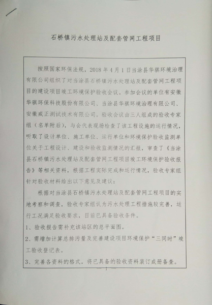 當(dāng)涂縣石橋鎮(zhèn)污水處理站及配套管網(wǎng)工程項(xiàng)目驗(yàn)收意見