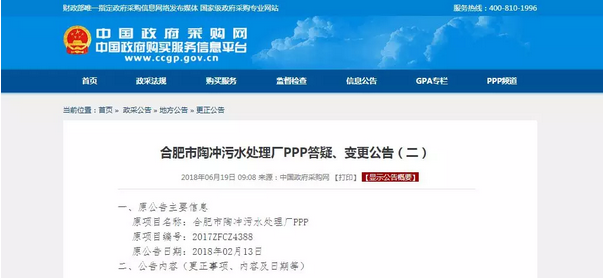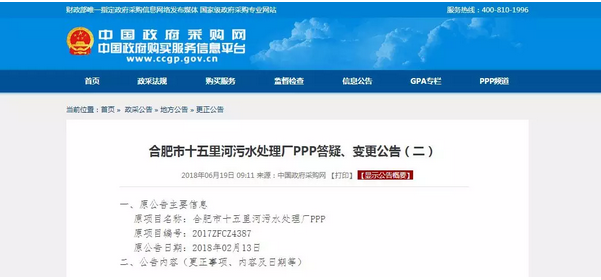 近日,備受關(guān)注的合肥市十五里河污水處理廠、合肥市陶沖污水處理廠兩大PPP項(xiàng)目同時(shí)發(fā)布答疑、變更公告,將開標(biāo)時(shí)間(投標(biāo)截止時(shí)間)變更為2018年7月10日9:30。距離原定開標(biāo)時(shí)間過去2個(gè)月,這兩大污水廠即將再次展開爭奪戰(zhàn)。