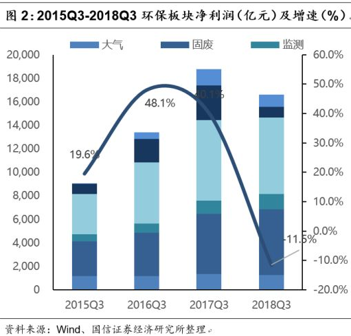 從整體來看:環(huán)保板塊2018年前三季度營收、凈利潤分別同比+6.1%、-24.0%,營收增速同比明顯下滑,凈利潤大幅度負增長。2018年前三季度,59家環(huán)保上市公司共實現(xiàn)營業(yè)收入1629.7億元,同比增長6.1%;共實現(xiàn)凈利潤143.7億元,同比下滑24.0%。板塊整體毛利率28.32%,同比下滑0.57pct;凈利率9.00%,同比下滑3.71pct,主要原因是資金面緊張,環(huán)保公司財務成本大幅度增加。與去年同期(營收+38.8%、凈利潤37.1%)相比,2018年前三季度環(huán)保板塊營收、凈利潤增速下滑明顯,特別是凈利潤出現(xiàn)大幅度的負增長。