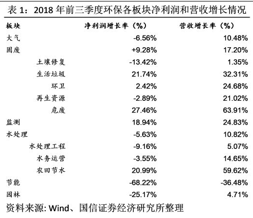 大氣板塊略為下降(凈利潤-6.6%,營收+10.5%)。固廢增長最快的是危廢(凈利潤+27.46%)和生活垃圾(+21.74%),再生資源和土壤修復板塊出現(xiàn)負增長,環(huán)衛(wèi)(凈利潤+2.42%,營收+24.68%)。監(jiān)測板塊增長迅速(凈利潤+18.94%,營收+24.83%)主要受取消環(huán)保一刀切,監(jiān)測站點下沉到鄉(xiāng)鎮(zhèn),政府監(jiān)測需求上升影響。水處理板塊出現(xiàn)分化,水處理工程下跌明顯(凈利潤-9.16%,營收+5.07%),水務運營保持穩(wěn)健,農(nóng)田節(jié)水快速增長(凈利潤+20.99%,營收+59.62%)。 園林環(huán)保受資金緊張影響利潤下跌(凈利潤-25.17%,營收+4.71%)。