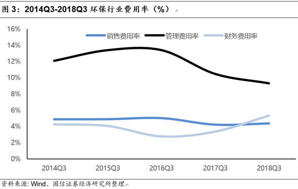 前三季度環(huán)保板塊總體的財務費用率為5.33%,同比提高了1.97pct,增幅明顯,而管理費用率和銷售費用率兩項指標均有所下滑,表明環(huán)保企業(yè)前三季承擔著巨大的資金成本上行壓力,同時盡可能地壓縮內(nèi)部成本,降低銷售和管理費用,以期熬過寒冬。