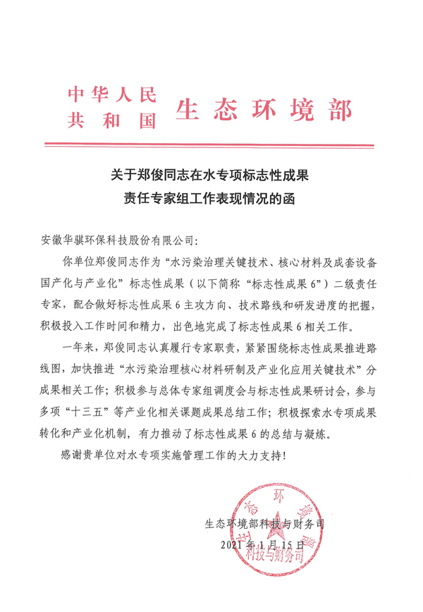 近日,國(guó)家生態(tài)環(huán)境部給安徽華騏環(huán)保科技股份有限公司發(fā)來(lái)了感謝信,對(duì)華騏環(huán)保副董事長(zhǎng)兼總工程師鄭俊先生作為“水污染治理關(guān)鍵技術(shù)、核心材料及成套設(shè)備國(guó)產(chǎn)化與產(chǎn)業(yè)化”標(biāo)志性成果二級(jí)責(zé)任專(zhuān)家期間的出色工作表示肯定與感謝。