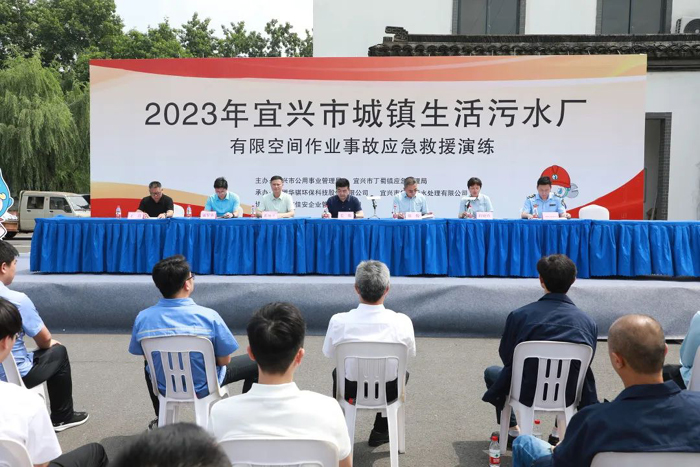 6月,小荷初露,茉莉飄香,宜興市華騏污水處理有限公司在“畢業(yè)季”里交出了一份令人滿意的答卷,宜興華騏從江蘇省76座縣級以上城鎮(zhèn)污水廠中脫穎而出,在江蘇省住房和城鄉(xiāng)建設(shè)部2021年度城鎮(zhèn)污水處理廠運行管理工作考核中獲評優(yōu)秀。而今年6月亦是第22個全國“安全生產(chǎn)月”,為進一步鞏固污水板塊安全生產(chǎn)形勢,加強污水處理行業(yè)有限空間作業(yè)管理,提高有限空間作業(yè)事故應(yīng)急救援能力,6月20日,由宜興市公用事業(yè)管理局、宜興市丁蜀鎮(zhèn)應(yīng)急管理局主辦,安徽華騏環(huán)??萍脊煞萦邢薰境修k的“2023年宜興市城鎮(zhèn)生活污水廠有限空間作業(yè)事故應(yīng)急救援演練”在宜興市華騏污水處理有限公司開展,宜興市公用事業(yè)管理局黨組書記、局長毛俊擔(dān)任演練總指揮,華騏環(huán)保副董事長鄭俊出席并觀摩了此次演練,副總裁程曉玲做主題發(fā)言。宜興華騏污水公司、佳安企業(yè)管理公司參與演練,丁蜀鎮(zhèn)應(yīng)急局、宜興市城市污水廠、宜興北控公司、歐亞華都水務(wù)公司等相關(guān)領(lǐng)導(dǎo)全程觀摩演練活動。