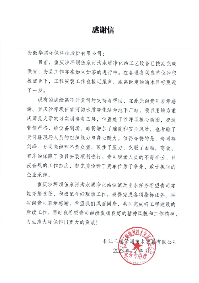 近日,長(zhǎng)江三峽綠洲技術(shù)發(fā)展有限公司向安徽華騏環(huán)??萍脊煞萦邢薰景l(fā)來(lái)感謝信,對(duì)華騏環(huán)保工作人員在建設(shè)重慶沙坪壩伍家河溝水質(zhì)凈化站項(xiàng)目過(guò)程中,高效、有序的保障了項(xiàng)目順利安裝表示高度贊揚(yáng)與衷心感謝。
