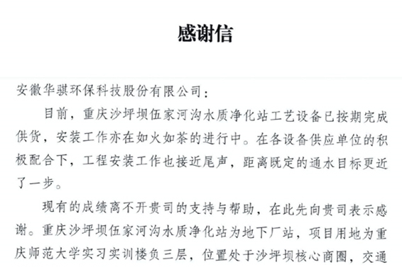 近日,長江三峽綠洲技術(shù)發(fā)展有限公司向安徽華騏環(huán)??萍脊煞萦邢薰景l(fā)來感謝信,對華騏環(huán)保工作人員在建設(shè)重慶沙坪壩伍家河溝水質(zhì)凈化站項(xiàng)目過程中,高效、有序的保障了項(xiàng)目…